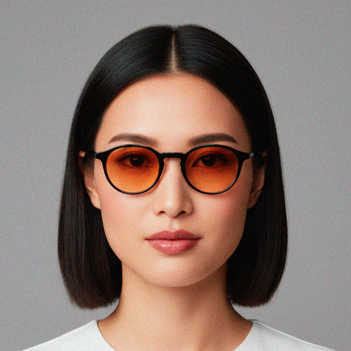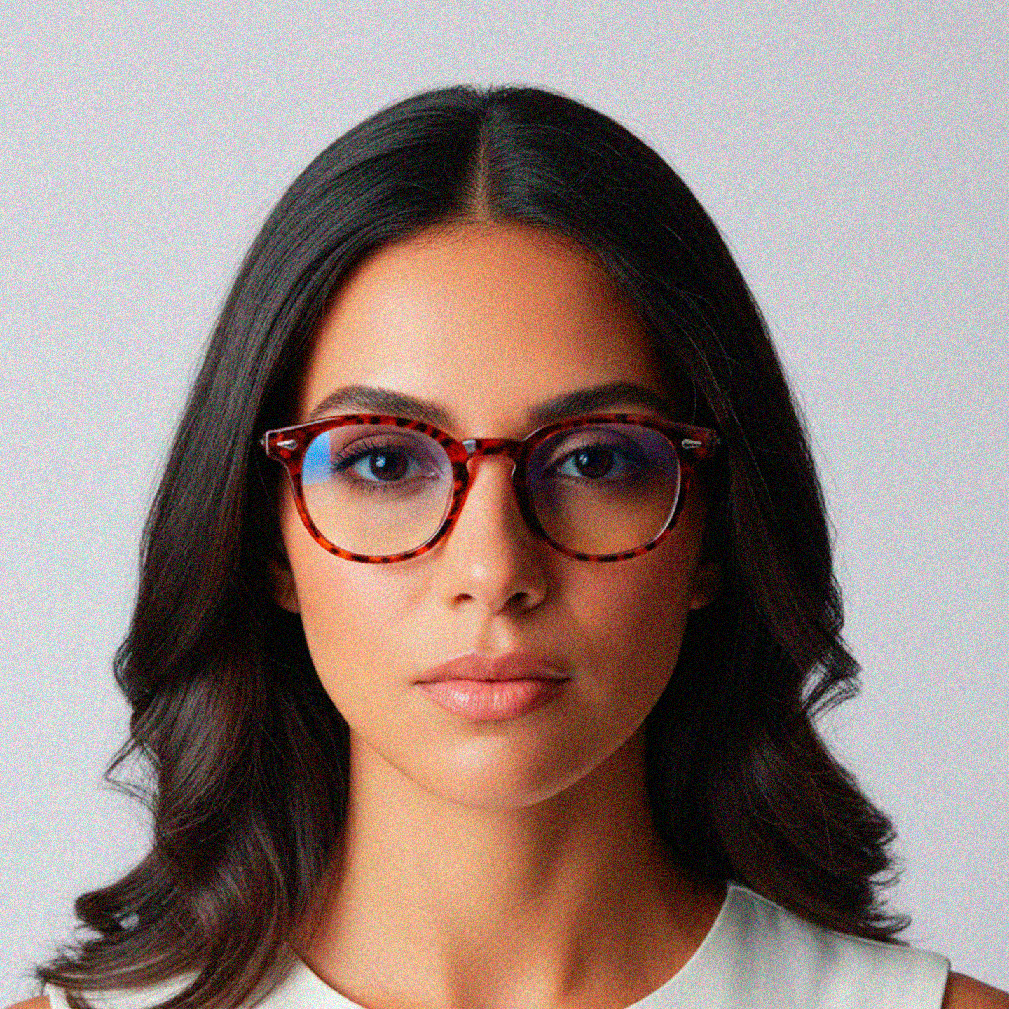 Glasses that match: models with round or oval lenses soften the lines of the face and create an elegant visual contrast. Avoid frames that are too straight.
